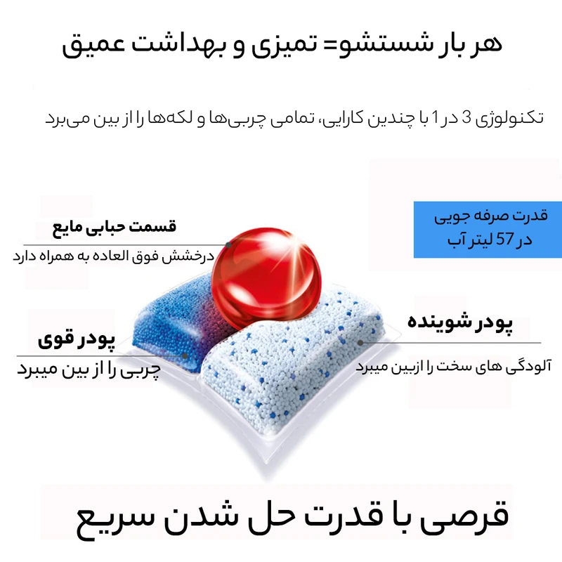 3 محفظه جداگانه با انحلال سریع – تمیزکنندگی پیشرفته لکه‌های 24 ساعته – بدون نیاز به شست‌وشوی اولیه – محافظت از دستگاه در برابر رسوب – مناسب برای دمای پایین